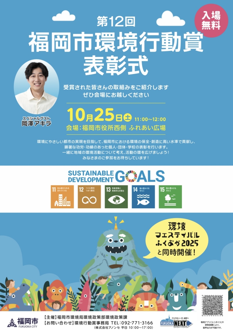 福岡市内で環境に貢献された方を表彰する「福岡市環境行動賞」の表彰式が行われ岡澤アキラがゲスト出演します。